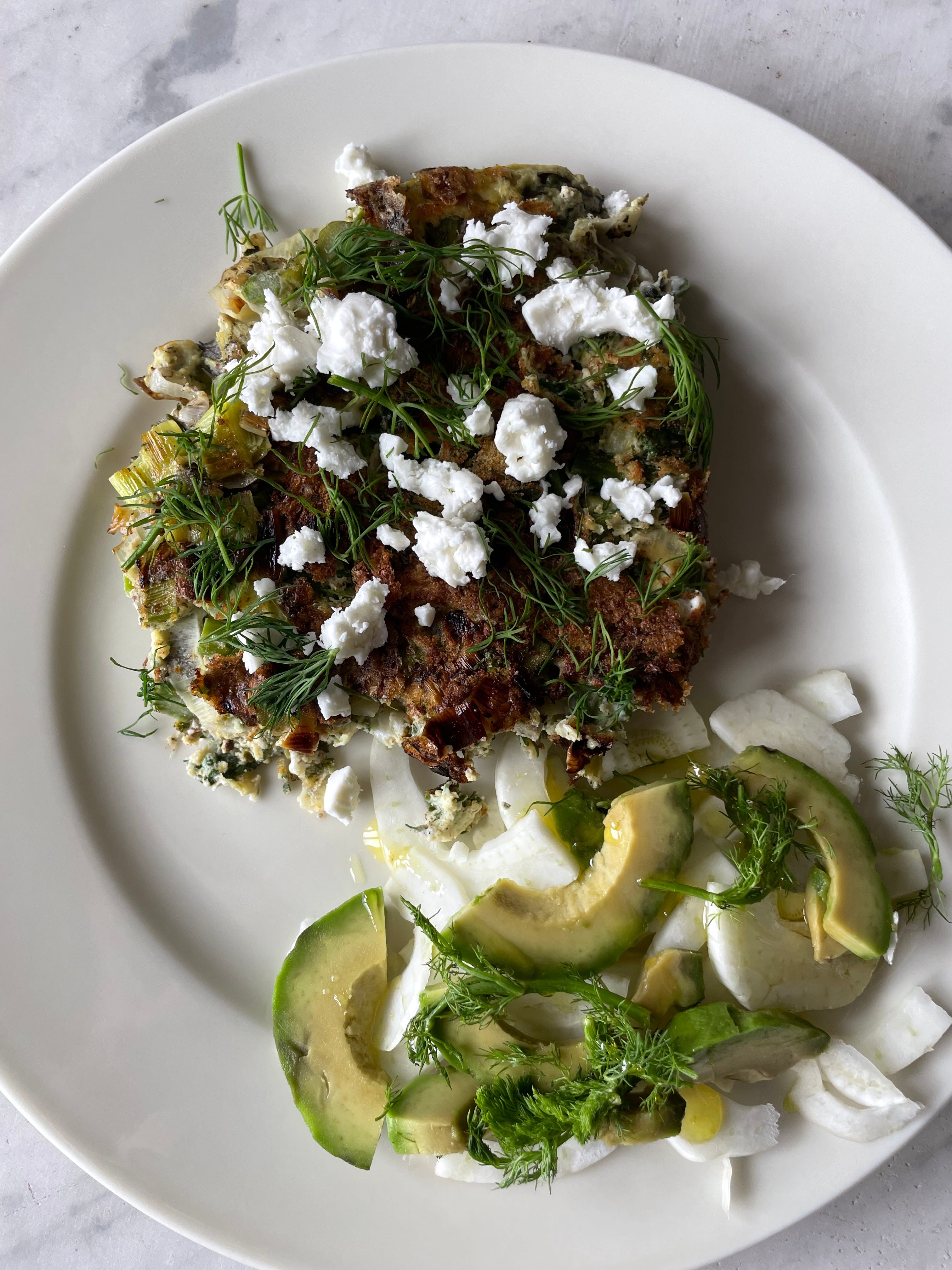 Serve with more feta and fresh herbs on top. I had a fennel (with its frills) and avocado salad on the side. ENJOY!